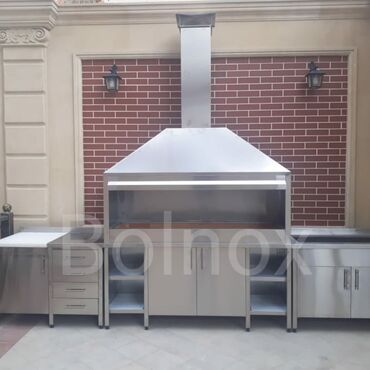 - Açıq hava üçün paslanmayan polad manqal/şiş kabineti və modul iş stansiyası: iri tüstü çəkən başlıq və baca, geniş bişirmə bölməsi; yanlarda saxlama dolabları, çekmecələr və açıq rəflər; hamar səthlər gigiyenik təmizliyə uyğundur; teras və həyət mətbəxləri üçün ideal komplekt.