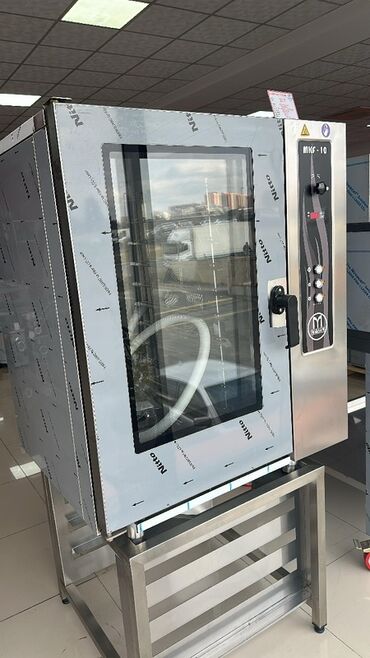 - Konveksiya sobası (raf üzərində): şüşəli geniş qapı, daxili ventilyator, buxar xətti üçün qoşulma hortumu; dəqiq mexaniki idarəetmə düymələri; bərabər istilik dövriyyəsi ilə sürətli bişirmə.