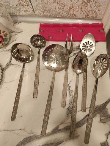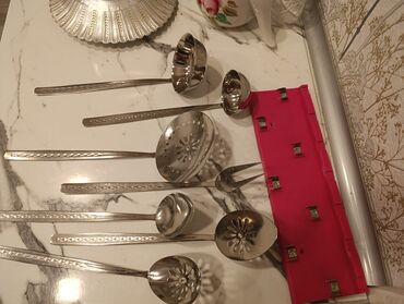 Mətbəx üçün paslanmayan poladdan hazırlanmış iri serve alətləri dəsti. sovetindi,cox yaxwi veziyyetdedi,tezedi,iwlenmeyib, nerjavekadi,divardan asmaq ucun asilqani da var
