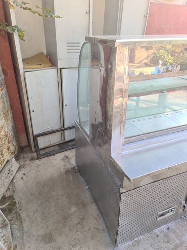 sirniyat ucun hersey tezedir upakofka - Şüşəli soyuducu vitrin (üfüqi ön şüşə, çoxsəviyyəli rəflər, alt hissədə kompressor bloku və ventilyasiya qəfəsi). Elektrik kabeli və idarəetmə paneli üzəri...