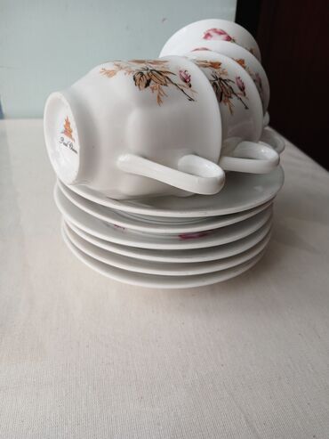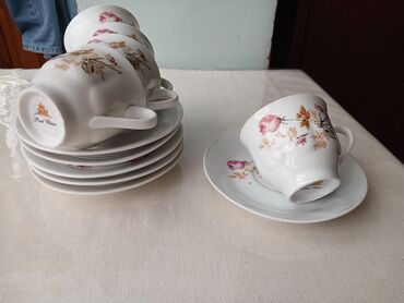 Çay/kofe servisi dəsti – klassik porselen Tərkibi (şəkillərdə olanlar): - Qapaqlı çaydan - Süd qabı (iki ölçüdə: iri və kiçik) - Qapaqlı şəkər qabı - Fincanlar və altlıqlar - Kiçik boşqablardan də...