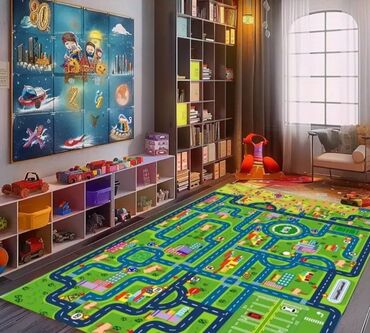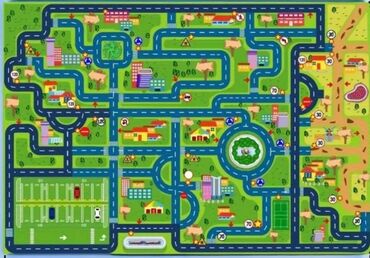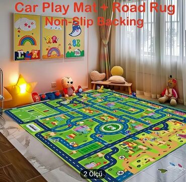 Uşaq otağı üçün oyun xalçası - Dizayn: Yaşıl fon üzərində şəhərcik və