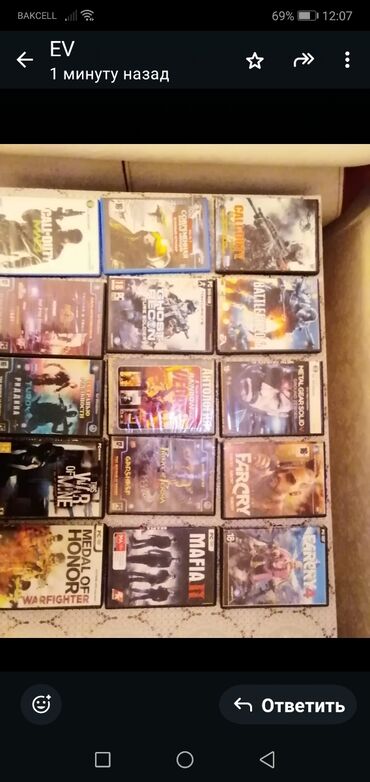 Satışda müxtəlif janrlarda oyun disklərinin toplası. Qutulu versiyalar, üzlükləri və kitabçaları ilə. Şəkildəki adların bir qismi:
