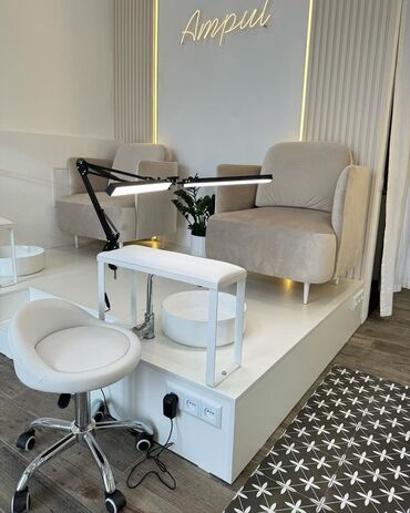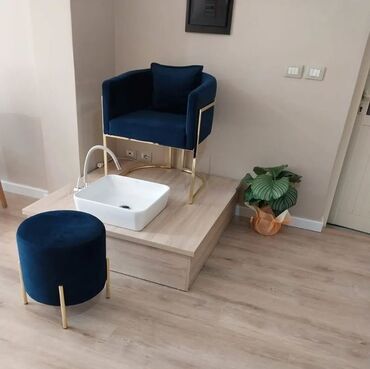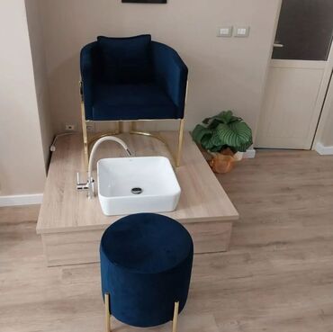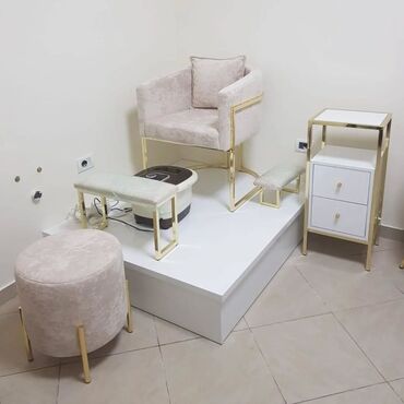 Manikür və pedikür salonu üçün dəst. Dəstə rahat kreslo, ayaqaltı, taburet və iki çekmeceli dolab daxildir. Kreslonun və taburetin üzəri zərif parça ilə örtülmüş, dolab və ayaqaltının rəngi ilə uyğunlaşdırılmışdır. Dolabda manikür və pedikür üçün lazım olan ləvazimatları saxlamaq mümkündür. Dəst salonunuz üçün gözəl və rahat bir seçim ola bilər.