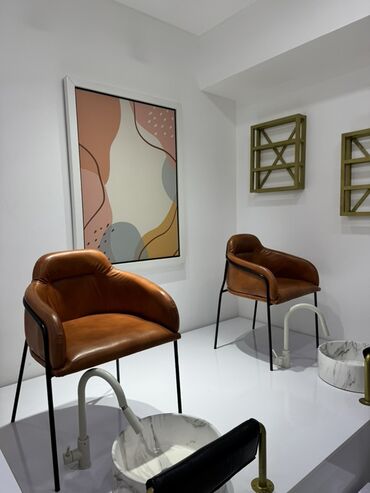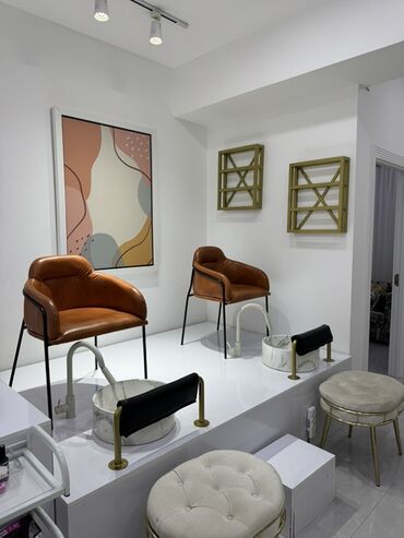 - 2 ədəd rahat oturacaqlı pedikür kürsüsü: yumşaq dəri örtük, qara metal karkas, erqonomik qoltuq dayaqları.
