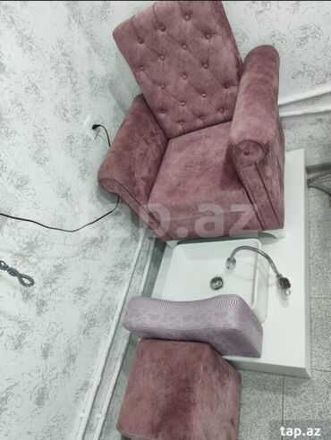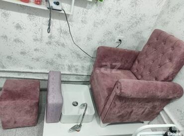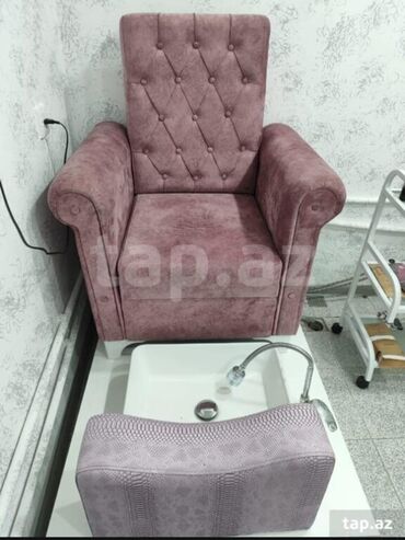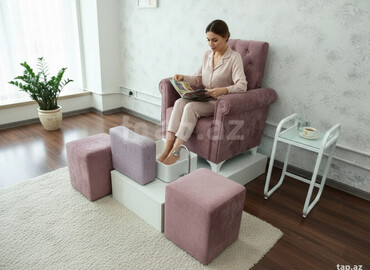 - Yumşaq, komfortlu oturacaq: yüksək arxalı, düyməli kapitone işliyi, enli qoltuqlar, məxməri toxumalı parça. Salon interyerinə uyğun zərif pudra/çəhrayı rəng.