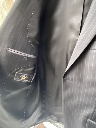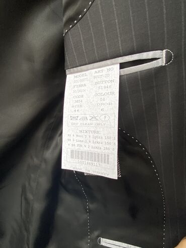 Kişi kostyumu – iki parçalı - Rəng: tünd boz, incə xətli (micro-check/çizgili) naxış - Model: 2 düyməli klassik pencək, dar krujevalı (notch) yaxa - Pencəkdə: sinə cibinin üstü (bilet cibi görünüş...