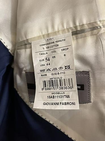 Giovanni Gilbert kişi kostümü. pencək. şalvar.jilet - Model: Slim Fit - Rəng: qara (daxili astar tünd mavi və bordeaux naxışlı) - Ölçü: 52 - Mövsüm: Winter (etiketdə) - Materiallar (etiket): parça...