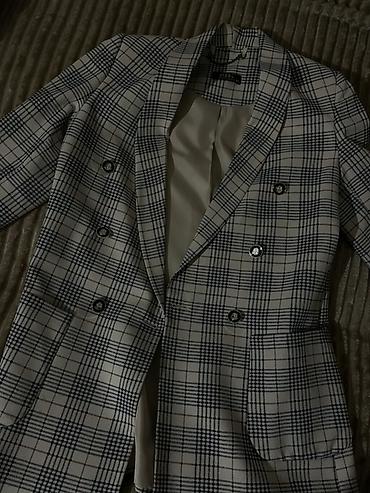Az Geyinilmis Qadınlar üçün klassik blezer - Brend: NİZE (etiketdə “NIZE” görünür) - Ölçü: 40 - Rəng və naxış: Açıq maviyə çalan boz ton, ağ xətli dama (check) naxış - Model: Düz kəsim, iki düymə...