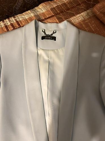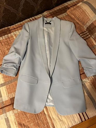 Brend: JIZEL (Made in Turkey), ölçü 42 Məhsul: Qadın blezeri - Rəng: Açıq mavi/pastel mavi - Model: Klassik düz kəsim, arxası və içi tam astarlı - Yaxa: Şal yaxa (knopkasız, açıq) - Qol: 3/4 qatla...