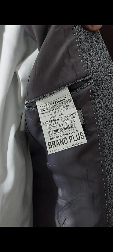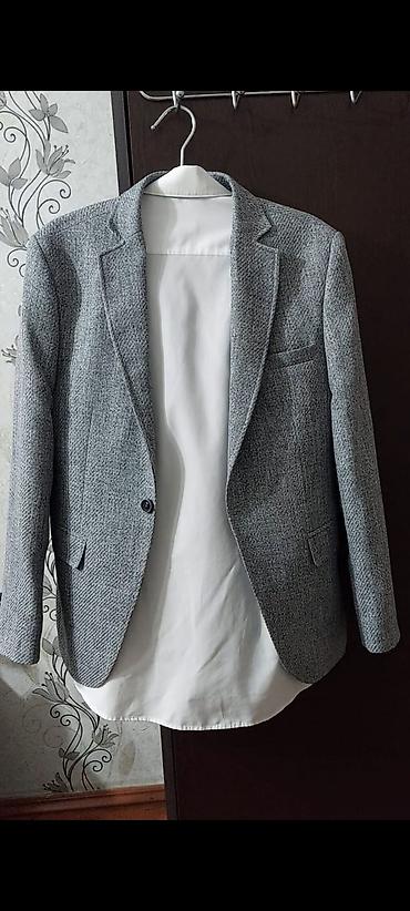 Kişi kostyum gödəkçəsi (şəkildəki). - Rəng: boz/boz-mavi ton - Model: klassik, iki düyməli, ingilis yaxası (notch lapel) - Ölçü: 48 (şəkildə qeyd olunub) - Ciblər: 2 ədəd yan flepli cib, 1 ə...