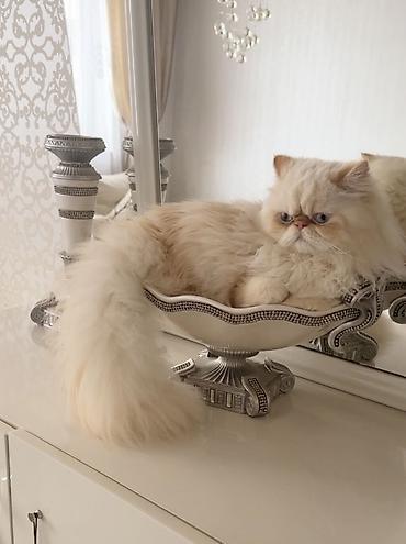 Iran tipli uzun tüklü pişik – mavi gözlü, krem-ağ rəng. Xüsusiyyətlər: - Qısa, yastı burunlu “doll face”/ekzotik görkəm - Çox sıx və ipək kimi yumşaq uzun yun, tüklü quyruq - Açıq krem-kara...