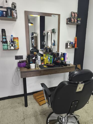 - Komfortlu bərbər kreslosu, geniş güzgü və işıqlandırma ilə səliqəli iş yeri