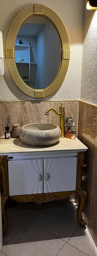 - Qızılı kran və klassik üslubda ayaqlı tualet masası/dolabı: üstü mərmər görünümlü, ikili qapılı saxlama bölməsi.
