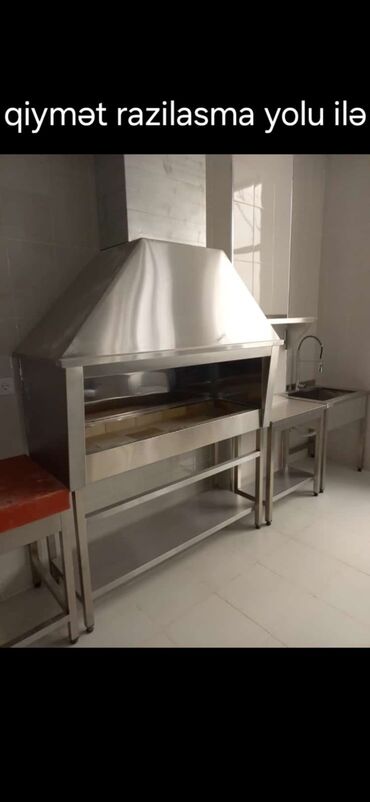 - Paslanmayan poladdan mətbəx avadanlıqları: iri ölçülü ızgara/kömür ocağı üçün üstdən güclü çəkişli havatəmizləyici-kübə (aspirasiya başlığı) ilə birlikdə bölməli iş masası. Alt hissədə geniş rəf zonası, yan tərəfdə paslanmayan polad iş masaları və ikiqablı lavabo bloku. Peşəkar mətbəx tələblərinə uyğun, təmizlənməsi asan, yüksək temperaturlara davamlı konstruksiya.