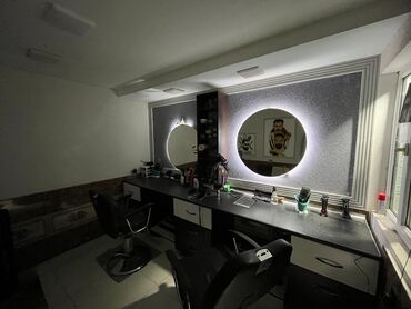 - 2 iş yeri olan geniş bərbər masası: dairəvi güzgülər, LED arxa işıqlı güzgü, çoxsaylı çekmece və rəflər