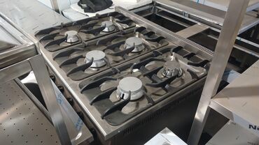 - Sənaye tipli qaz plitələri: 6 gözlü modellər, güclü brülörlər, çıxarıla bilən dəmir barmaqlıqlar, alovun dəqiq tənzimlənməsi üçün ön paneldə fırlatma düymələri. Paslanmayan polad korpus, işlək səthdə yüksək istilik paylanması.