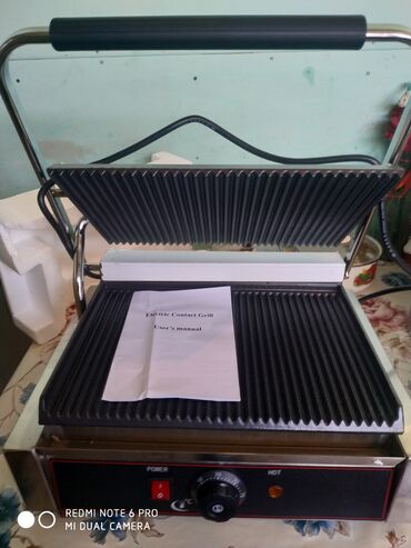 - Elektrik kontakt qril: üst-alt qabırğalı səth, temperatur tənzimləyicisi (döner düymə), göstərici işıqları (Power/Hot), istiliyədavamlı qulplu qapaq. Sendviç, panini, ət və tərəvəz qril üçün uyğundur.