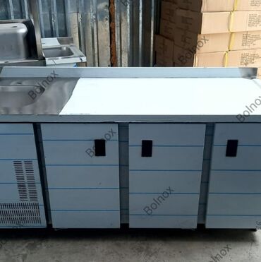 - Paslanmayan polad iş masasının kombinə edilmiş bloku: Solda dərin əl-üz yuma və ya məhsul yuma üçün lavabo, üstündə geniş hazırlıq səthi, aşağıda sürgülü qapılı soyuducu/ventilyasiya bölməsi və əlavə saxlama hissələri. Arxa tərəfdə sıçramaq əleyhinə bort.