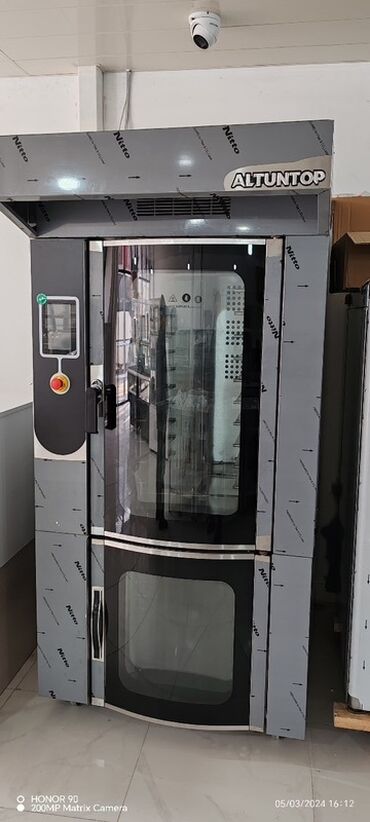 - ALTUNTOP markalı fırlanan rəfli soba: şüşə qapı, elektron idarə paneli, buxarlandırma funksiyası üçün bölmələr, böyük həcmli bişirmə.
