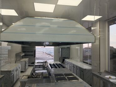 - Paslanmayan poladdan istehsal edilmiş iri ölçülü asma havalandırma-kupa (aspirasiya sistemi): güclü buxar və qoxu çıxarışı üçün, yanlardan zəncirli asma, işıqlandırmaya uyğun tavan konstruksiyası.