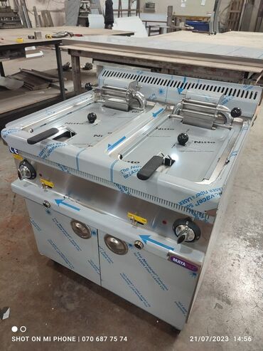 - İki gözlü sənaye fritoz: üst qapaqlı, yağ boşaltma kranları, ön paneldə mexaniki idarəetmə, aşağı bölmədə saxlanma şkafı, qaz/elektrik bağlantılarına hazır konstruksiya.