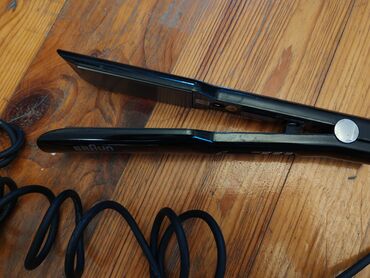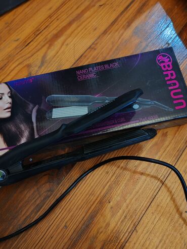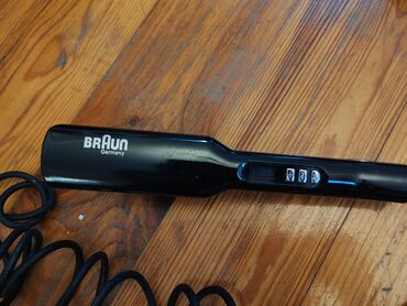 - Braun saç ütüsü: zərif keramika lövhəli düzləşdirici. Korpusunda “Braun Germany” loqosu, LCD ekran və +/- düymələri var. Uzun kabel, sürətli isinmə, asan temperatur idarəsi.
