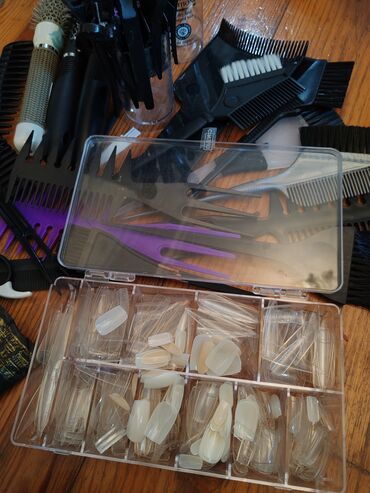 - Manikür üçün materiallar: şəffaf və süd rəngində müxtəlif ölçülü dırnaq tipsetləri (bölməli qutuda)