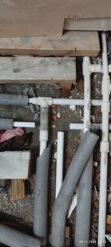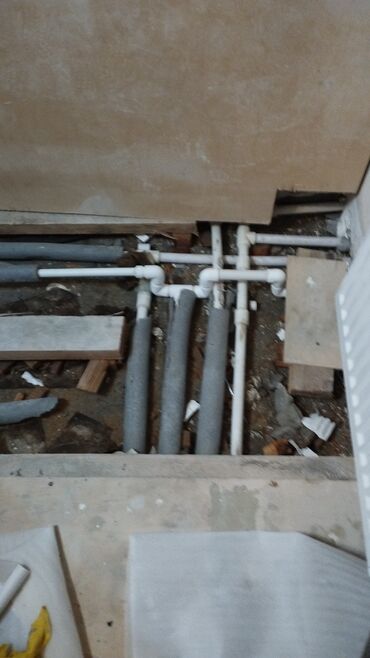 İşlər fotolardakı kimi: döşəmə altında izolyasiyalı boru xəttləri, paylayıcı qovşaqlar və kanalizasiya trassı. Material seçimi və komplektasiya işin tələbinə uyğunlaşdırılır.