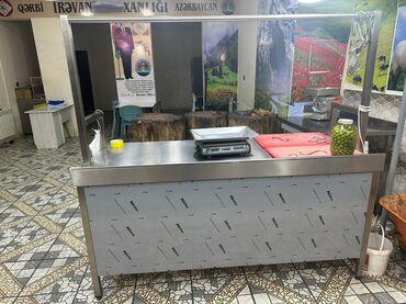 - Paslanmayan polad servis tezgahı: yuxarıdan açıq karkas, kəsim taxtası üçün yer, elektron tərəzi qoymaq üçün geniş düz səth.