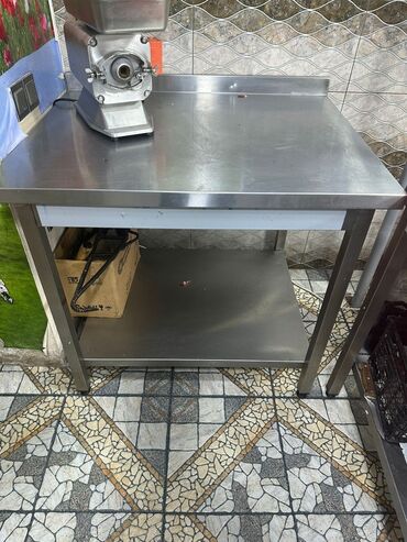 - Paslanmayan poladdan kəsim və hazırlıq masası: arxa bordürlü iş səthi, alt rəfli saxlanma bölməsi.