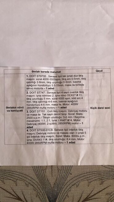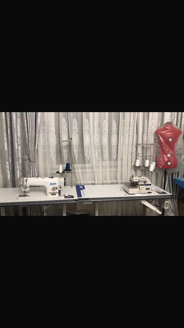 - Sənaye düz tikiş maşını (DOIT): sabit masa ilə, alt transportyorlu, sürət tənzimləyicisi və inteqrə lampası üçün çıxış. Aksessuar gözləri, xətkeşli iş səthi, sap kəsən qayçı və bobin saxlama bölməsi görünür.