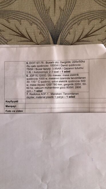 - Buxarlı ütü sistemi: ayrıca buxar generatoru (qazan) və ütü.