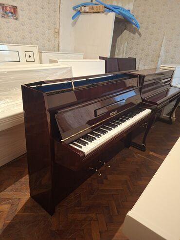 PETROF upright pianino – qızıl loqotipli, tünd qırmızı/qəhvəyi yüksək parlaq (poliş) korpus. Xüsusiyyətlər: - Akustik upright dizayn, klassik 88 klaviş - Ağ-qara klavişlər: hamar səth, rahat toxun...
