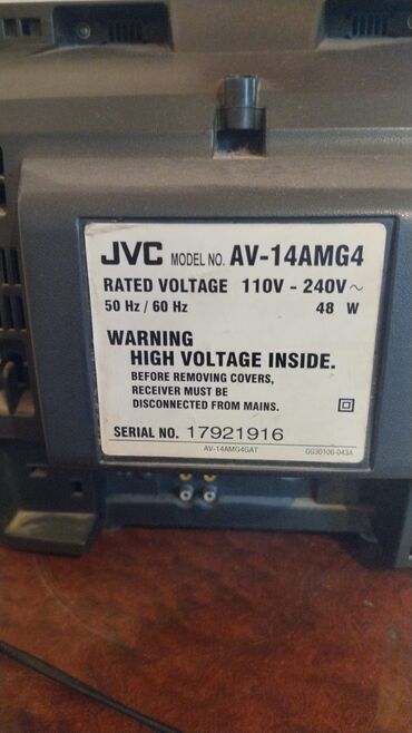 JVC AV-14AMG4 model nömrəli televizor. Gümüşü korpusa malikdir və kompakt ölçüsü ilə kiçik məkanlar üçün uyğundur. Ekranın altında dinamiklər və idarəetmə düymələri yerləşir. Arxa hissəsində enerji təchizatı və digər qoşulmalar üçün portlar mövcuddur. Evdə və ya ofisdə əsas baxış təcrübəsi üçün etibarlı seçimdir. Televizor 110V-240V gərginliklə işləyir və 48W enerji sərfiyyatına malikdir.