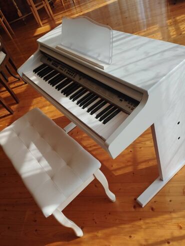 Elektron piano – klassik üslubda, ağ rəngli, inteqrasiya olunmuş konsol tipli korpus və uyğun oturacaqla. Son model olaraq qeyd olunur, tam işləkdir. Uşağın musiqidən ayrılması səbəbilə satıldığı b...