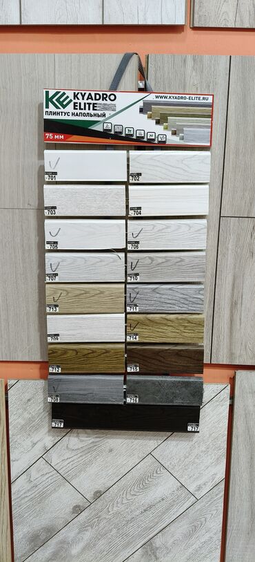 Məhsul: Döşəmə plintusları (KYADRO line) Təsvir: - Müxtəlif rəng və teksturalar: ağ, krem, bozun bir neçə tonu, açıq və tünd palıd, qəhvəyi, qrafit və tünd daş effekti. - Taxta damarını təqlid edə...