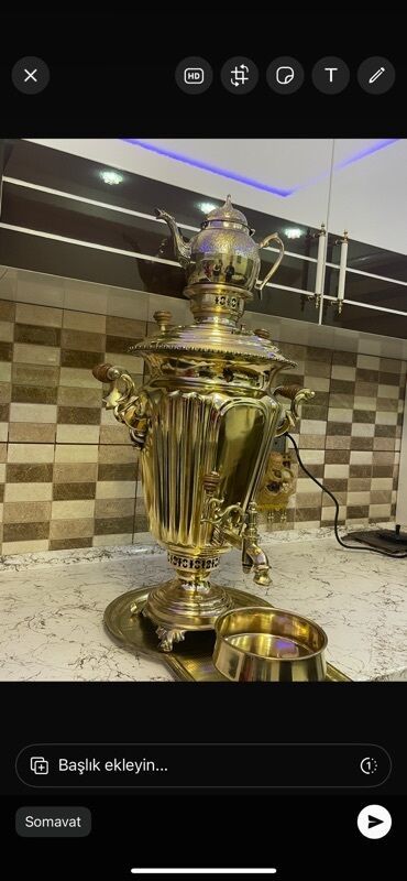 - Komplekt: samovar, üstündə oyma naxışlı çaydan, kranlı su çıxışı, köməkçi kasacıq, oval altlıq/tray, ayaqlı baza