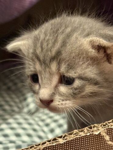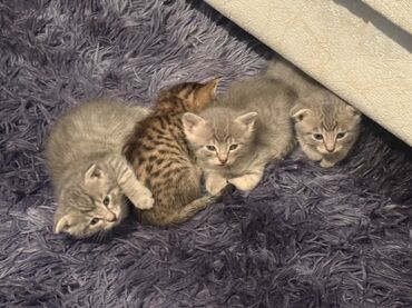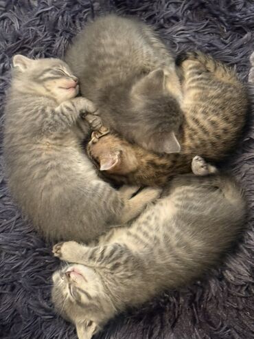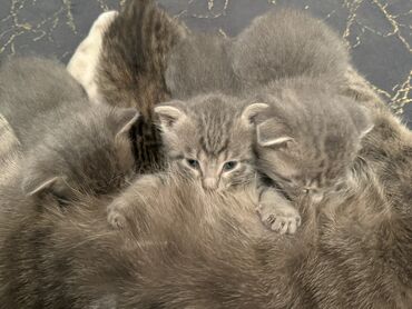 Boz tüklü balaca pişik balaları - Rəng: açıq-boz (biri tünd-boz qarışıq), qısa və yumşaq tük - Gözlər: mavi-boz tonlarında - Yaş: təxminən bir neçə həftəlik - Xasiyyət: sakit və mehriban, qucağı s...