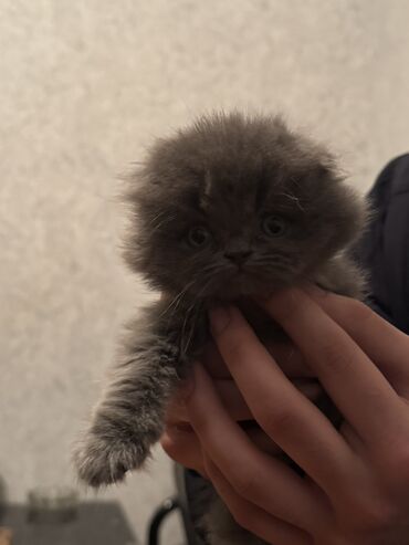 Scottish Fold balası – boz rəng, qısa tüklü, iri yumru gözlər, tipik yığılmış (aşağı) qulaqlar. - Yaş: balaca (şəkildə görünən ölçü). - Rəng: bərk boz (solid grey). - Xüsusiyyətlər: sakit və ...