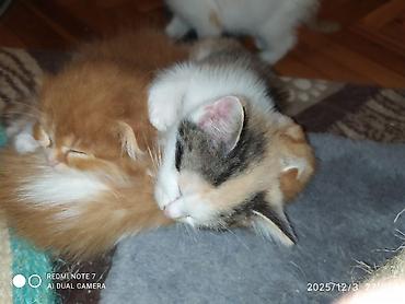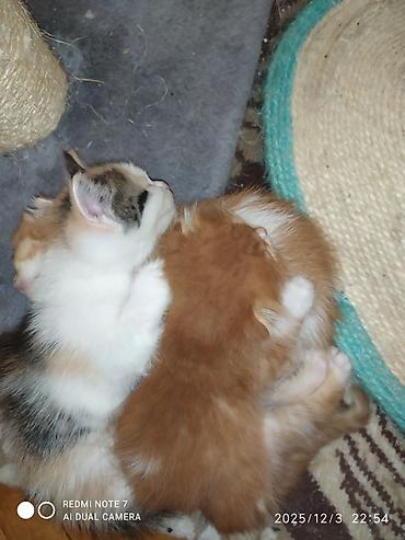 - Şirin və mehriban pişik balaları — biri üçrəng (ağ-qara-sarı), digəri zəncəfil rəngli.