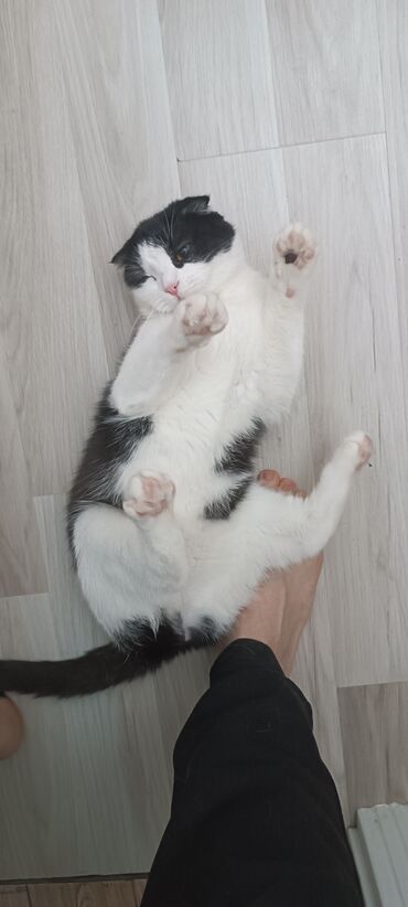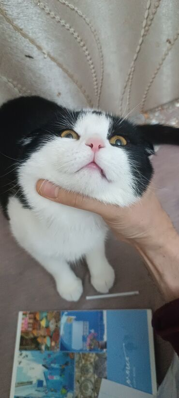 Sahibləndirilir. 1 yaş 20 günlük pişik balası. Anası Anqora, atası Şotland (əyrıqulaq). Yemək yeyir, qum tərbiyəsi var. Xüsusiyyətlər: - Rəng: ağ tüklü, başında tünd ləkəli naxış - Qısa quyruq, yu...