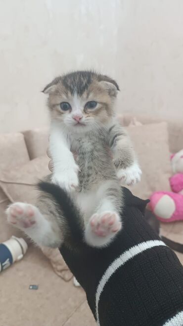 Skottish Fold (qatlanan qulaqlı) balaları - Rəng: boz (gümüşü) tabby naxışlı - Qulaqlar: tipik qatlanan, yumru baş forması - Xasiyyət: mehriban, sakit və oyunbaz; insanla təmasa tez öyrəşir Temiz...