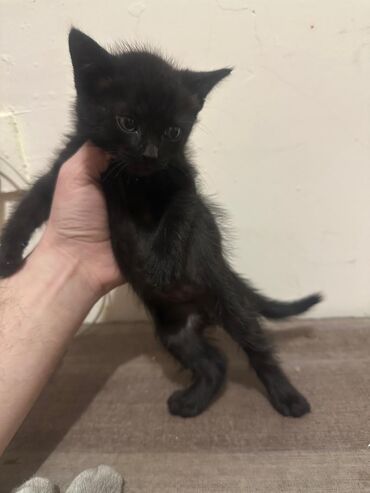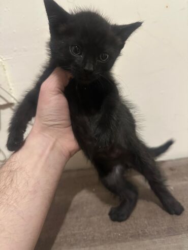 Qara balaca pişik balası – ev heyvanı Xüsusiyyətlər: - Yaş: təxminən balalıq dövrü (körpə) - Rəng: tam qara tüklər, sinəsində kiçik ağ ləkə - Göz rəngi: bal rəngi/sarı - Qulaqlar dik, quyruğu uzun...