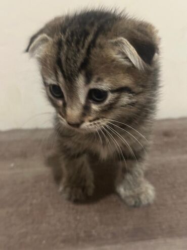 Gözəl boz rəngli balaca pişik balası - Rəng: boz, tünd və açıq zolaqlı, sinə və pəncələrdə ağ ləkələr - Gözlər: iri və ifadəli - Quşqun qulaqlar, qısa yumşaq tüklü quyruq - Çox oynaq və maraqlıdır...