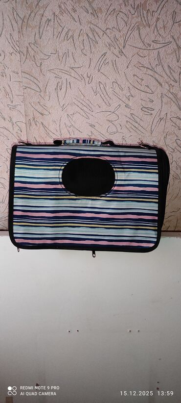 Pişik daşıma çantası - Naxış: krem rəngli fon üzərində sevimli pişik fiqurları, pəncə və balıq sümüyü elementləri - Material: möhkəm parça, formaya saxlayan sərt yan divarlar - Ölçü: orta ölçü (pi...