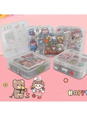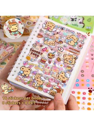 - Şəffaf və rəngli PET vərəqlər: “16 stickers per book: 8 stickers + 8 PET” qeydli dəftərciyin içində tematik səhifələr.