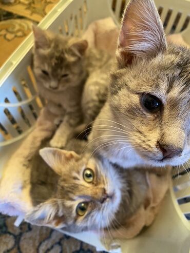 Məhsul: Ev pişiyi (balaca) Sahiblendirilir Təsvir: - Rəng: qarışıq təkir – kürəyində qəhvəyi-boz xətlər, sinə və pəncələrdə ağ, üzündə narıncı ləkələr. - Gözlər: iri, tünd. - Qulaqlar: böyük və di...