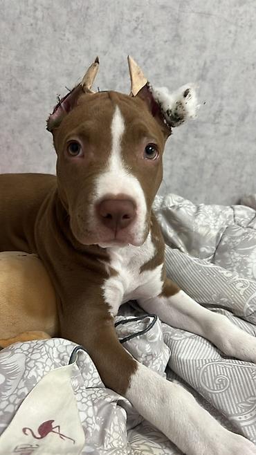 Amerikan Pitbull Terrier tipli it - Rəng: qəhvəyi (şabalıdı) gövdə, sinə və pəncələrdə ağ ləkələr - Qulaqlar qısaldılmış formadadır - Güclü, əzələli bədən quruluşu, enli döş qəfəsi - Orta ölçü, mö...