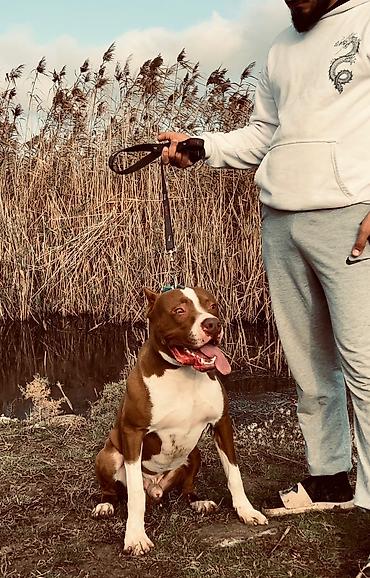 Amerikan Pit Bull Terrier – erkək, qəhvəyi-ağ rəngli - Güclü, əzələli bədən quruluşu, çevik və enerjili - Qısa, parlaq tüklü örtük: qəhvəyi rəng, sinə və ön pəncələrdə ağ işarələr - Kəskin diqqət ...